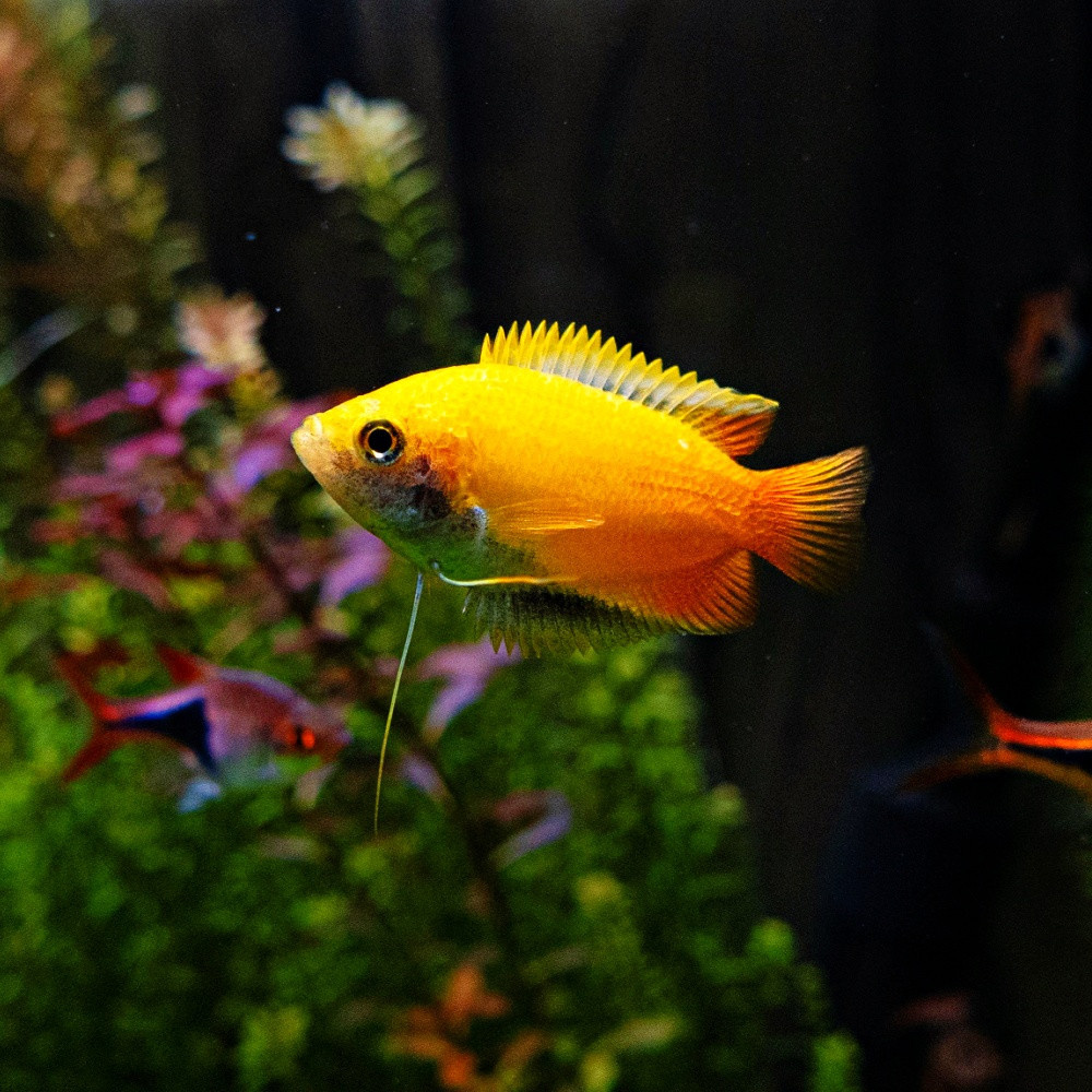 Colisa chuna Gold is een kleine, kleurrijke honing goud goerami van 4–5 cm, waarbij de mannetjes fel goudgeel of oranje zijn en vrouwtjes minder opvallend.